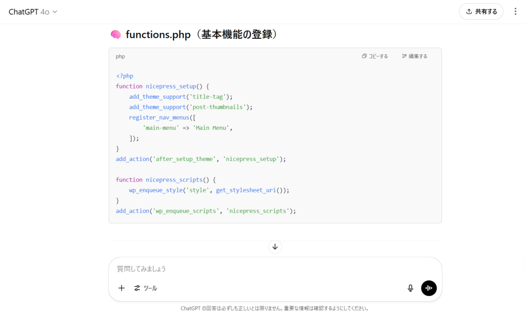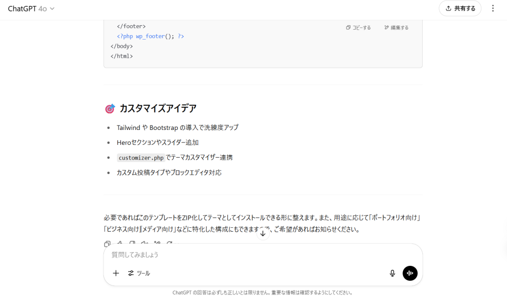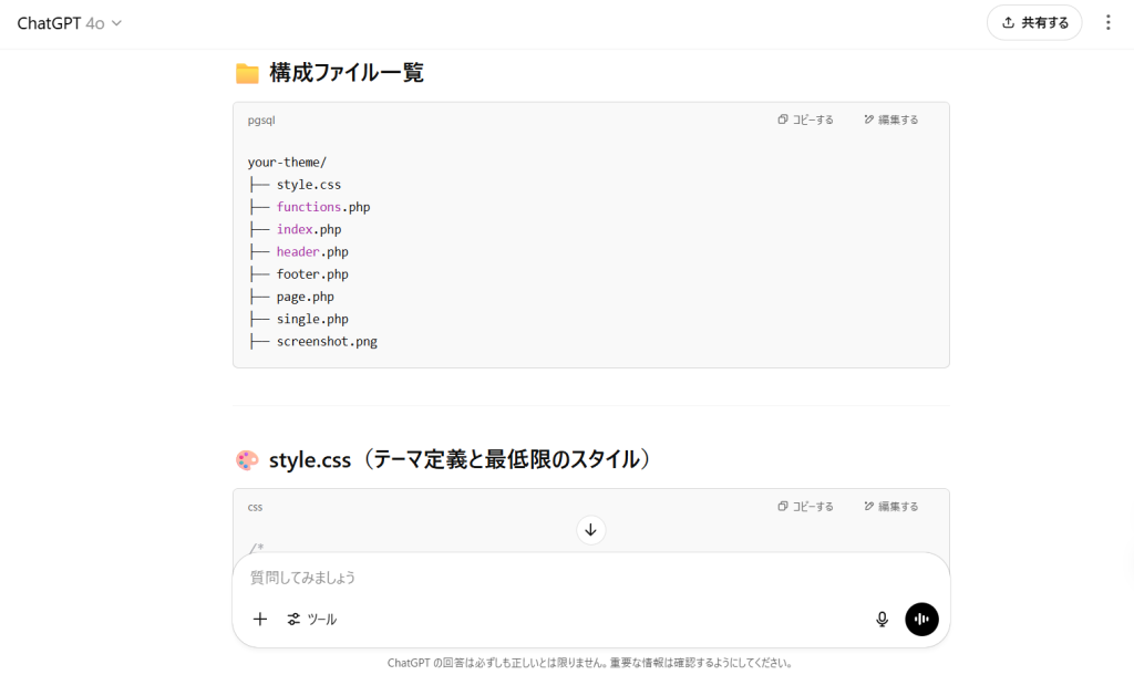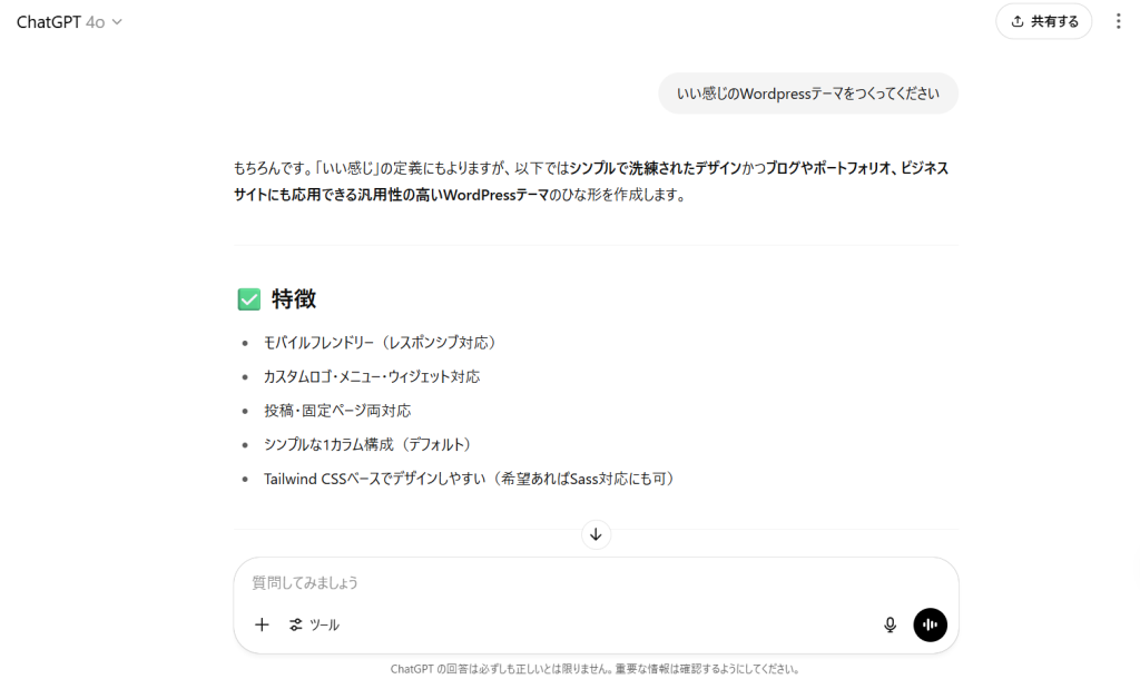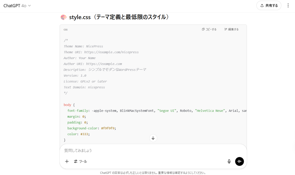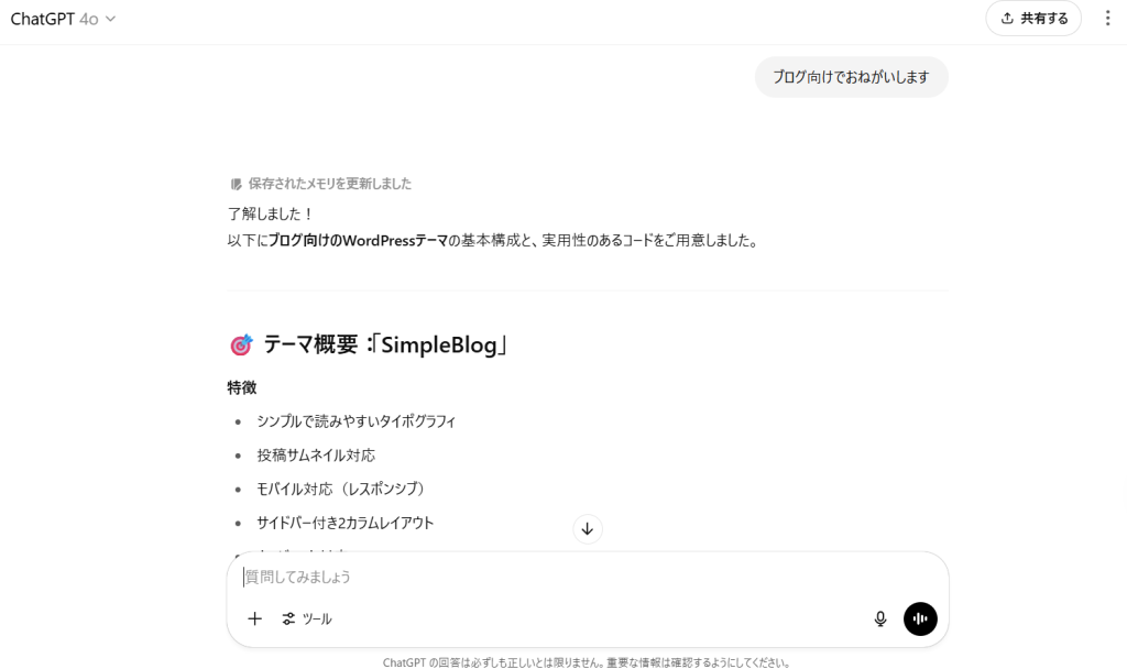 僕のこのブログのテーマはデフォルトのままにしていたので、せっかくだからAIにテーマを作ってもらうことにしました。自分で作るのは面倒だし、せっかくChatGPTに課金しているのに使わないのはもったいないので。